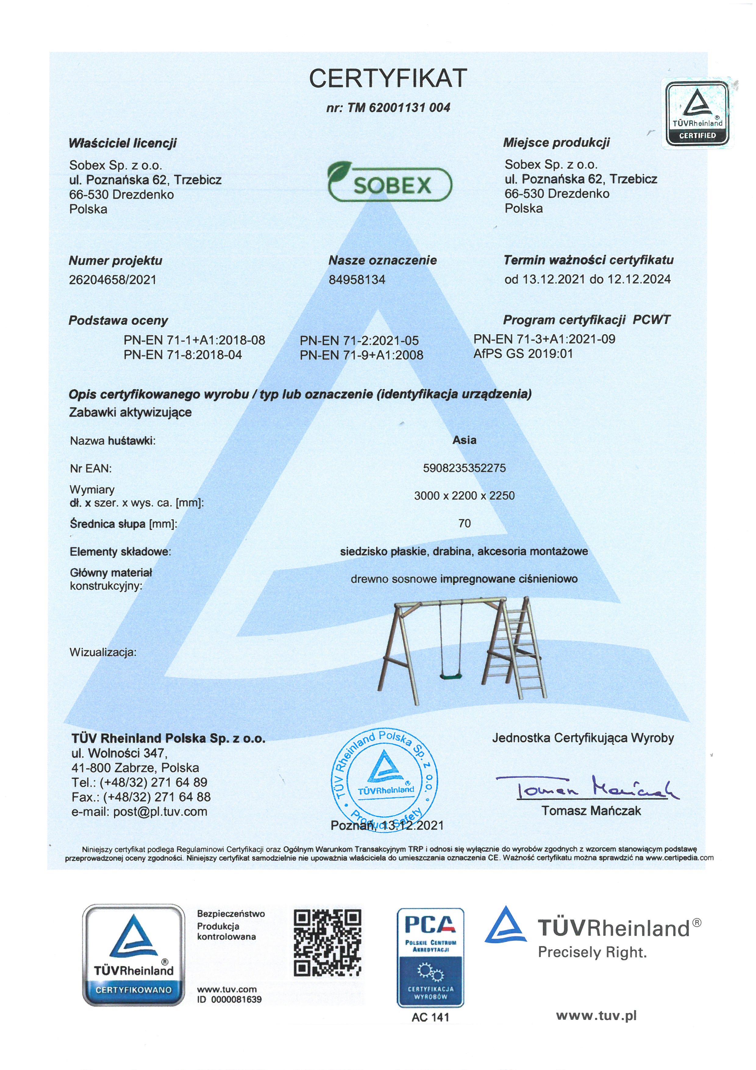 CERTYFIKAT TUV HUŚTAWKA ASIA