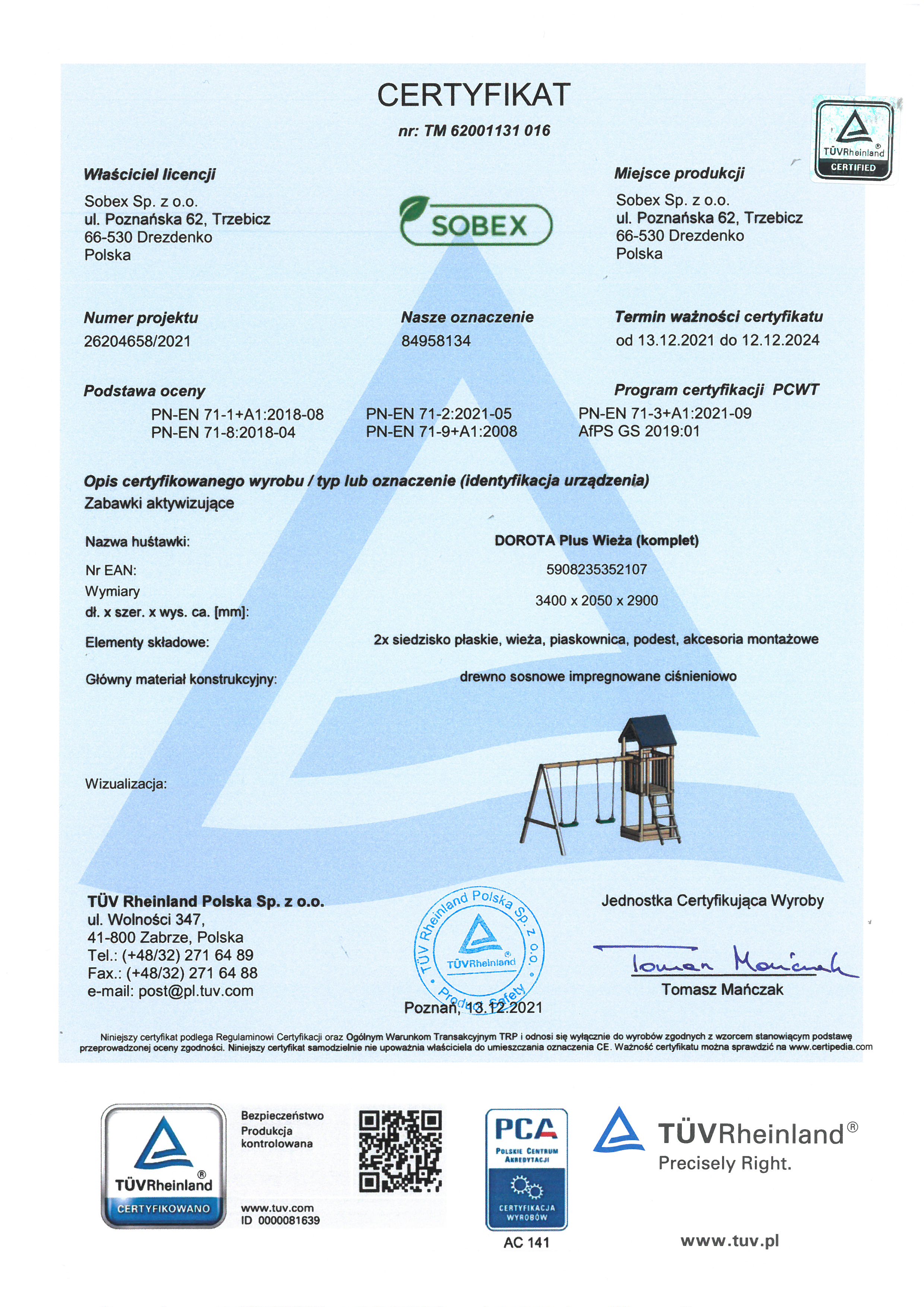 CERTYFIKAT TUV HUŚTAWKA DOROTA