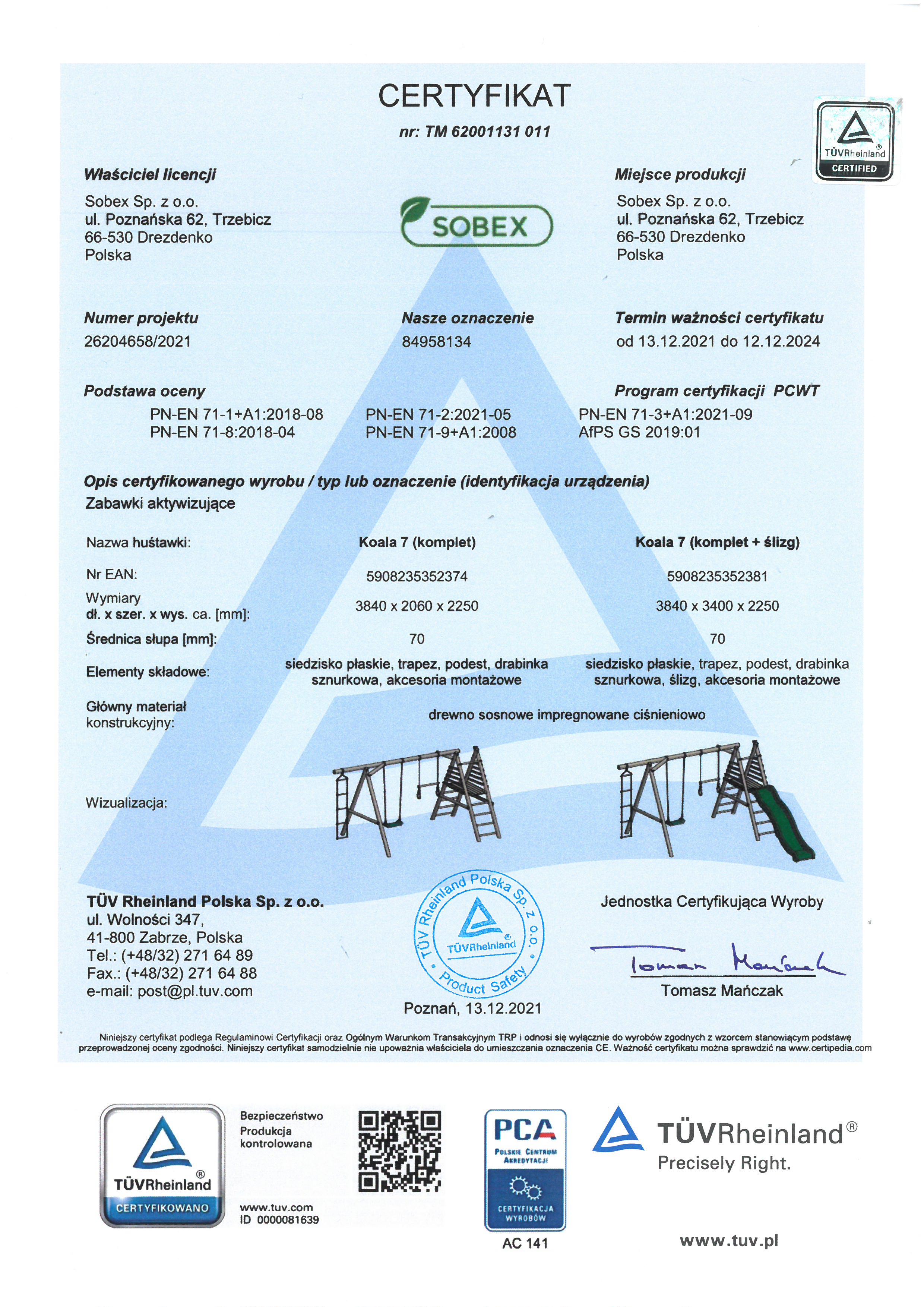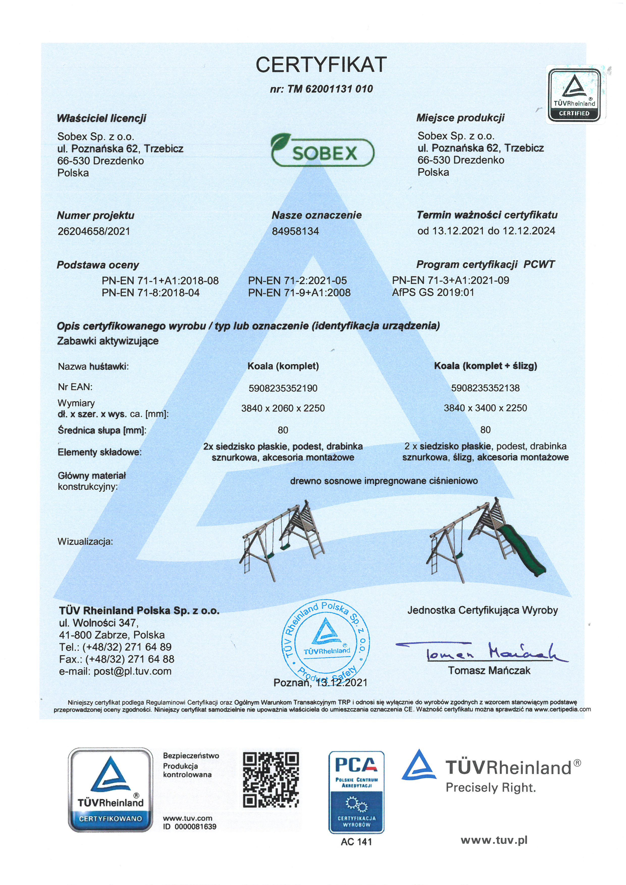 CERTYFIKAT TUV HUŚTAWKI KOALA
