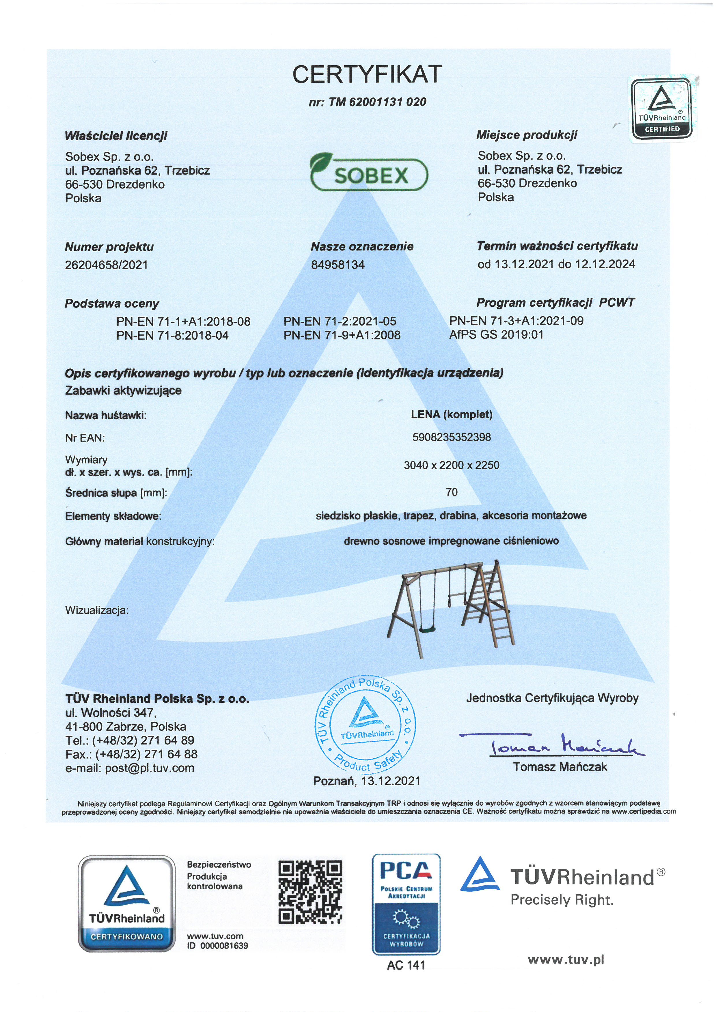 CERTYFIKAT TUV HUŚTAWKI AGATA