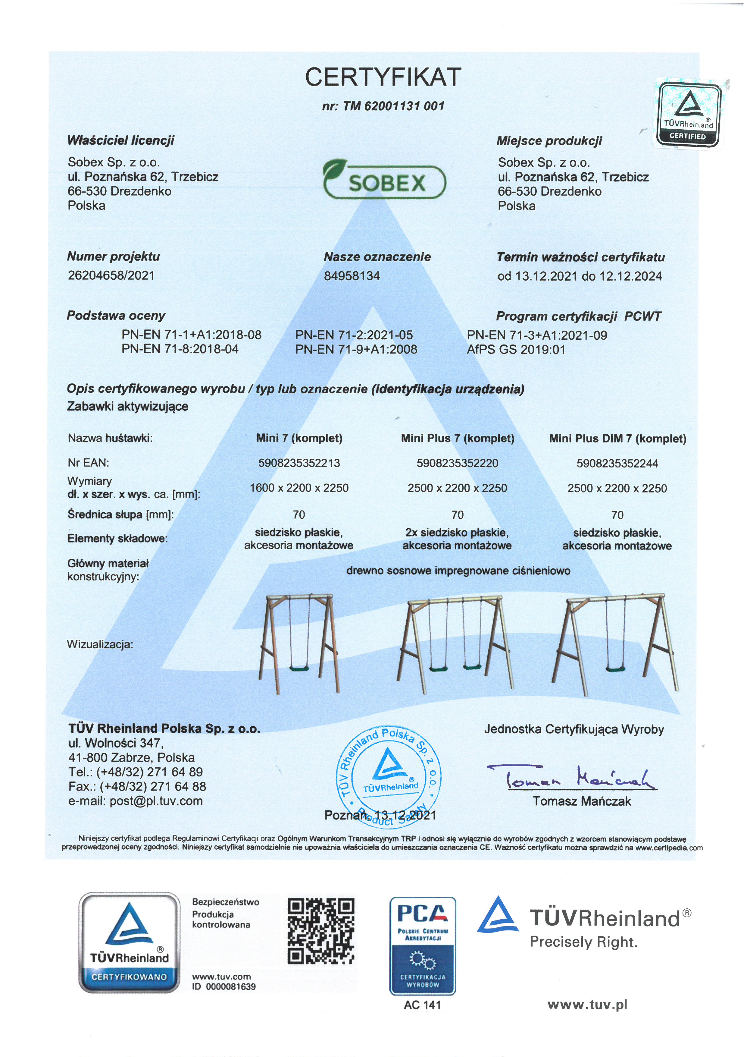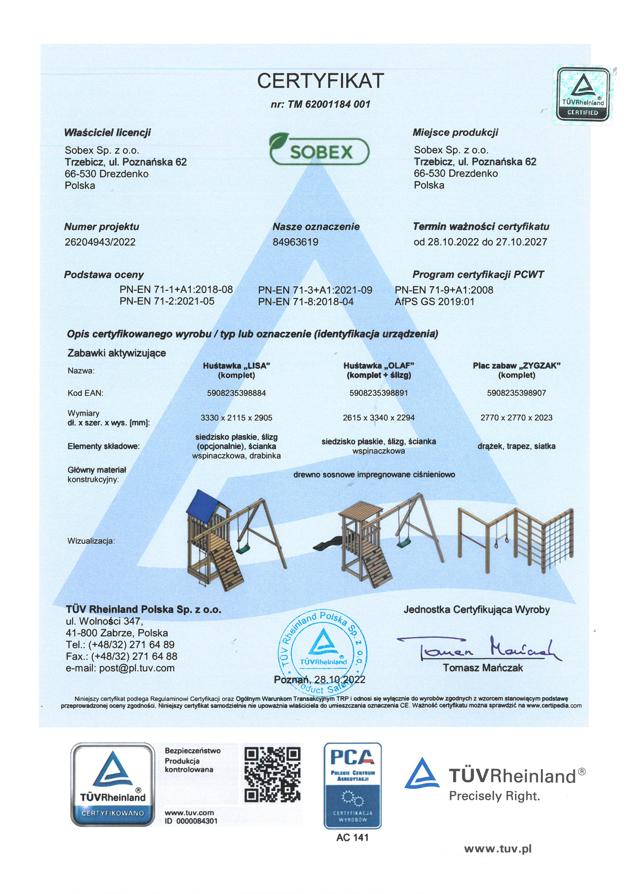 CERTYFIKAT TUV HUŚTAWKI JACEK