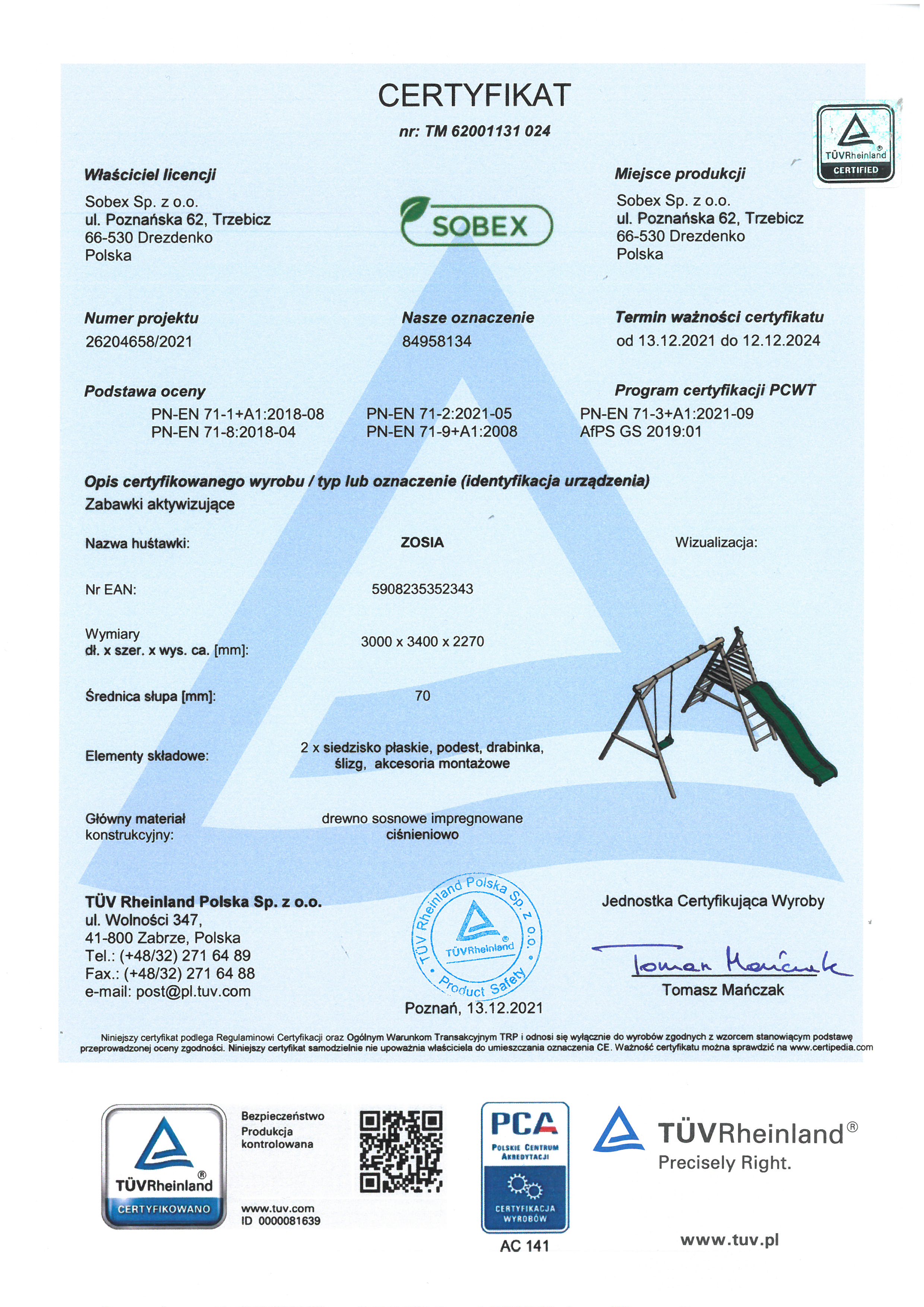 CERTYFIKAT TUV HUŚTAWKA ZOSIA
