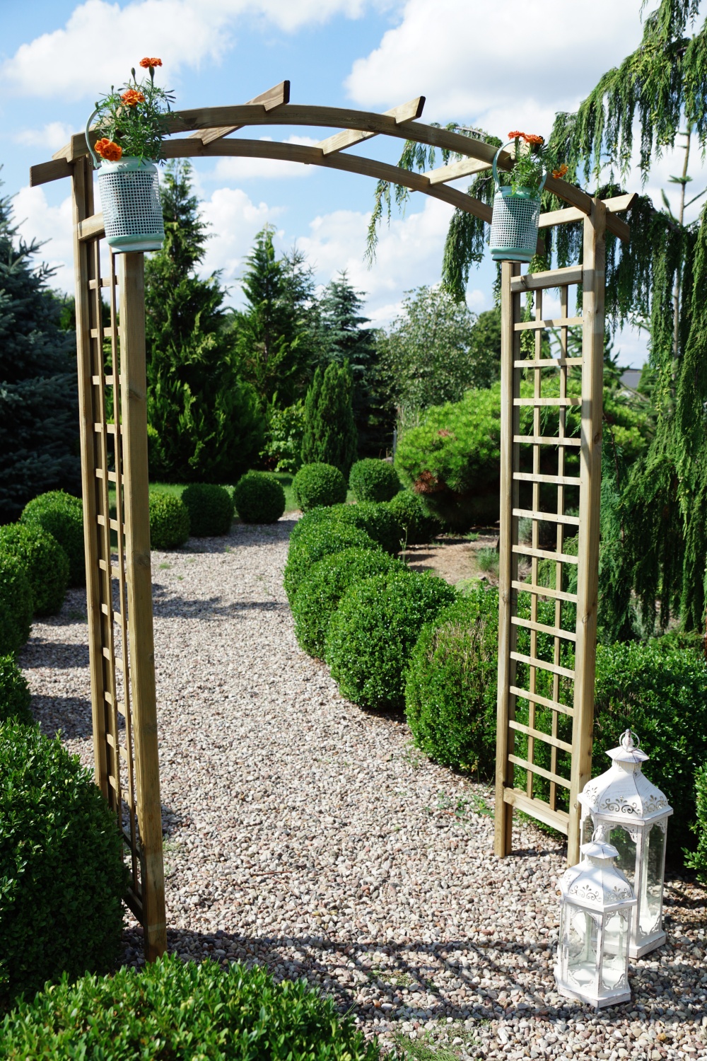 Pergola Frezja z łukiem może stanowić oryginalny element architektury naszego ogrodu. Oprócz dekoracji spełnia również funkcję praktyczną  jako podpora dla pnączy roślin, dzięki czemu można uzyskać efekt pięknej roślinnej bramy bądź alejki.  Pergolą można również odizolować i zasłonić mniej interesujący fragment ogrodu lub ustawić ją tak żeby dawała cień w upalne dni.