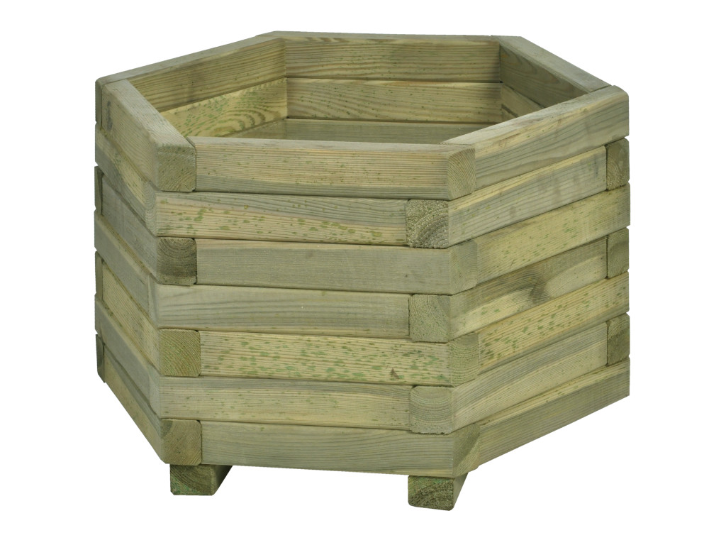Donica sześciokątna G34 o wymiarach FI 55X35 cm to uniwersalna i praktyczna propozycja dla każdego ogrodu. Posiada spokojną kolorystykę oraz tradycyjny styl co sprawia, że doskonale wkomponuje się  w zieloną architekturę otoczenia. Stosunkowo nie duże wymiary umożliwiają jej wykorzystanie również na małych powierzchniach typu taras czy balkon. Dodatkowo naturalna barwa otwiera możliwości jej pomalowania na dowolny kolor. Donica została zaimpregnowana ciśnieniowo,  co zapewnia jej trwałość, ochronę przed szkodnikami oraz odporność na działanie czynników atmosferycznych.
