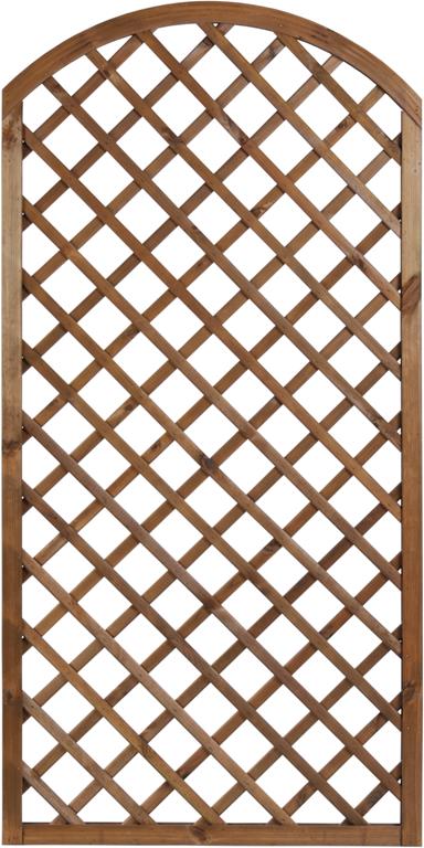 Kratka diagonalna BJORK R34 z łukiem 90x180 Brąz stanowi element architektury ogrodowej służący do aranżacji ogrodu, jak również do stworzenia niepowtarzalnego otoczenia wokół domu. Jej połączenie z pnącymi roślinami daje możliwość wykonania wielu pięknych i eleganckich kompozycji. Kratka stanowi również doskonałą podporę dla roślin, wspomagając tym samym ich wzrost. Dzięki niej jesteśmy w stanie samodzielnie wykreować wymarzoną  strefę wypoczynku i relaksu. Ażurowa konstrukcja wraz z roślinami zapewni przyjemny cień oraz kameralne otoczenie, jednocześnie umożliwiając stały dostęp świeżego powietrza. Kratkę można także zamontować na balkonie w celu zachowania większej prywatności, a pnące kwiaty dodatkowo go upiększą. Drewno zostało zaimpregnowane ciśnieniowo, co gwarantuje ochronę   przed grzybami niszczącymi drewno i owadami,   jednocześnie wybarwia drewno  ciepłym brązowym kolorem.