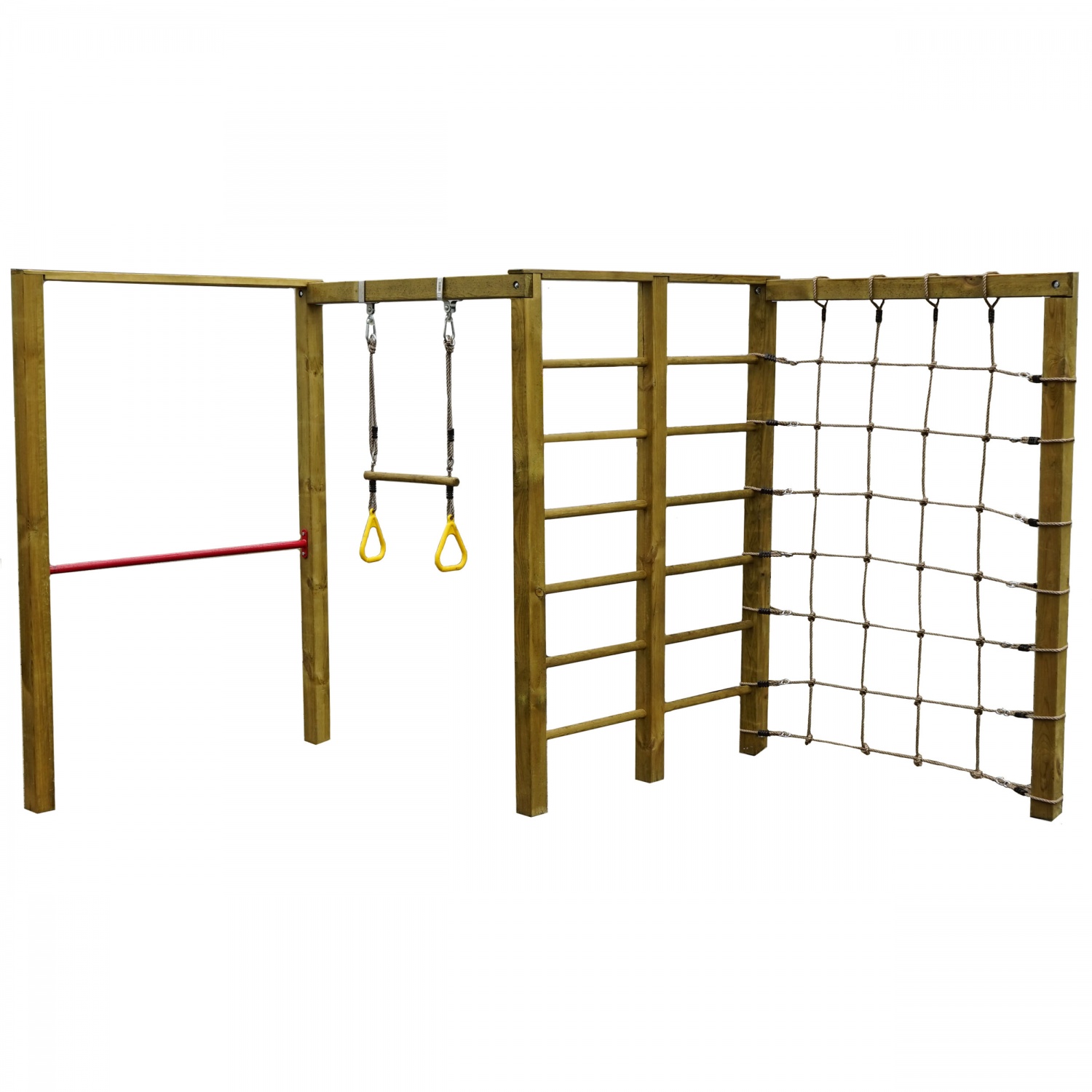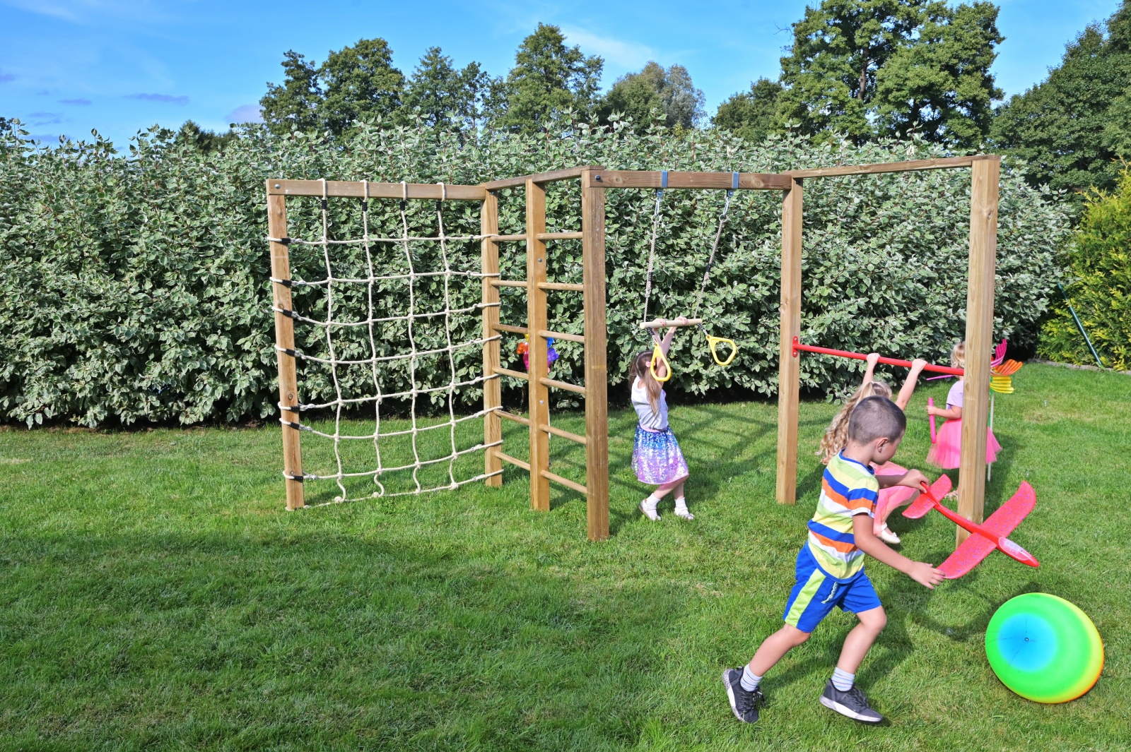 W skład zestawu wchodzą: konstrukcja drewniana, drążek, trapez,  ścianka linowa, zestaw montażowy, instrukcja.