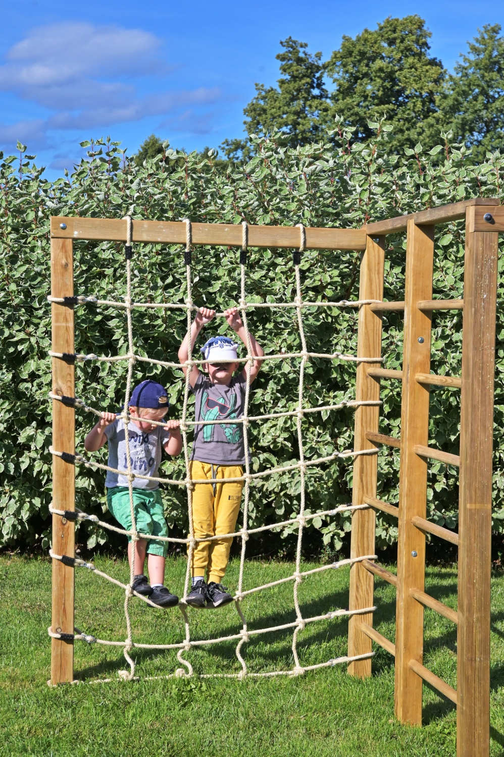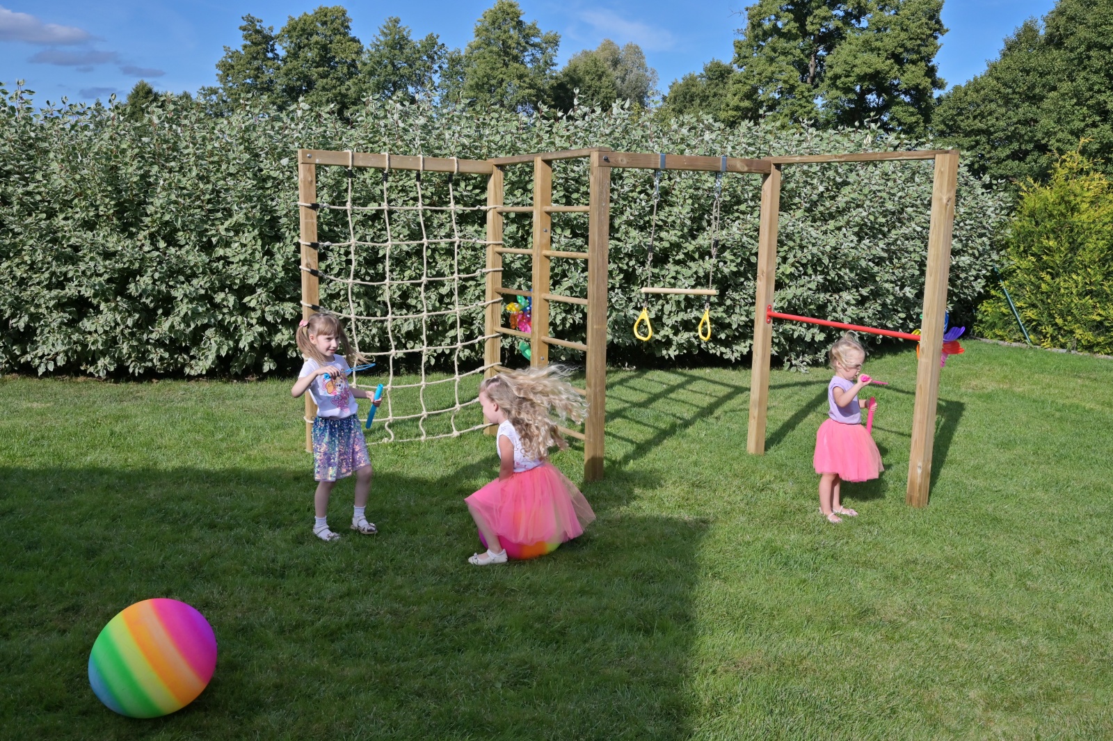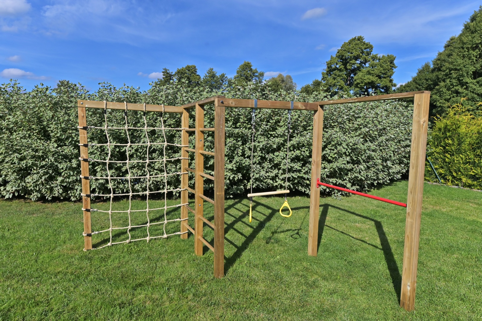 Plac zabaw ZYGZAK (komplet) – to nowoczesne wielofunkcyjne urządzenie, które zachęca dziecko do beztroskiej zabawy a jednocześnie stanowi solidny trening sprawnościowy. Wspinanie się  po ściance linowej rozwija zmysł równowagi, wykonywanie ćwiczeń na drążku oraz trapezie  wzmacnia mięśnie i poprawia zręczność dziecka. Może być z powodzeniem używana przez jedynaka, ale często jest również zaproszeniem do wspólnej zabawy.