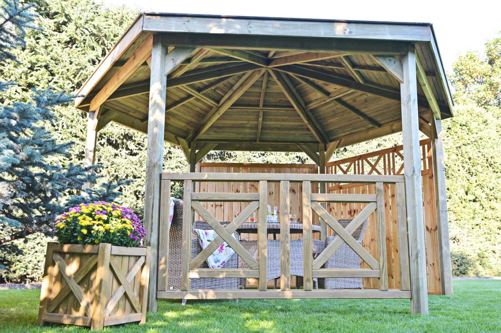 Płot tarasowy BAWARIA 180x90 cm to solidne wykonanie w połączeniu z tradycyjnym wzornictwem nawiązującym do klimatów malowniczej Bawarii.  Wraz z pozostałymi produktami tej serii tworzy idealną kompozycję, przeznaczony na balustrady, zabudowania tarasów, balkonów.  Drewno zostało zaimpregnowane ciśnieniowo, co gwarantuje ochronę  przed grzybami niszczącymi drewno i owadami.  Dodatkowym atutem jest możliwość pomalowania płotu na dowolny kolor.